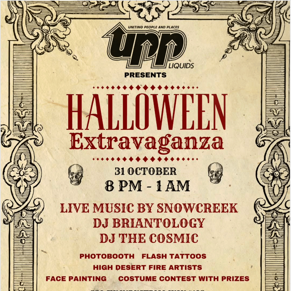 On Halloween night, join UPP Liquids for a night of music and fun, featuring live music and DJ’s Briantology & The Cosmic, + flash tattoos, face painting, a photo booth, the High Desert Fire Artist, and a costume contest with prizes!